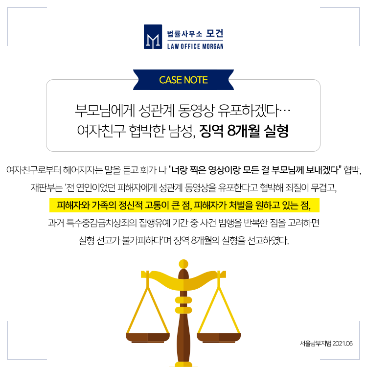 재판부는 A씨가 내연관계에 있던 B씨와 성관계를 하는 장면을 동영상 촬영한 것을 빌미로 B씨에게 만남 지속을 요구하면서 협박하고, 위 촬영물을 B씨의 가족과 지인 약 30명에게 전송한 것으로 그 죄질이 매우 나쁘다고 보았습니다. 또 유포 범위에 B씨 가족은 물론 B씨 자녀의 친구 부모들까지 포함되는 등 이 사건으로 B씨가 사회적 관계를 차단하고 이사를 해야 했으며 아무런 잘못이 없는 B씨의 가족들에게까지 피해가 미친 것과 현재까지 B씨로부터 용서를 받지 못한 점 등을 고려하면 A씨에 대한 실형 선고가 불가피하다 판단했는데요.