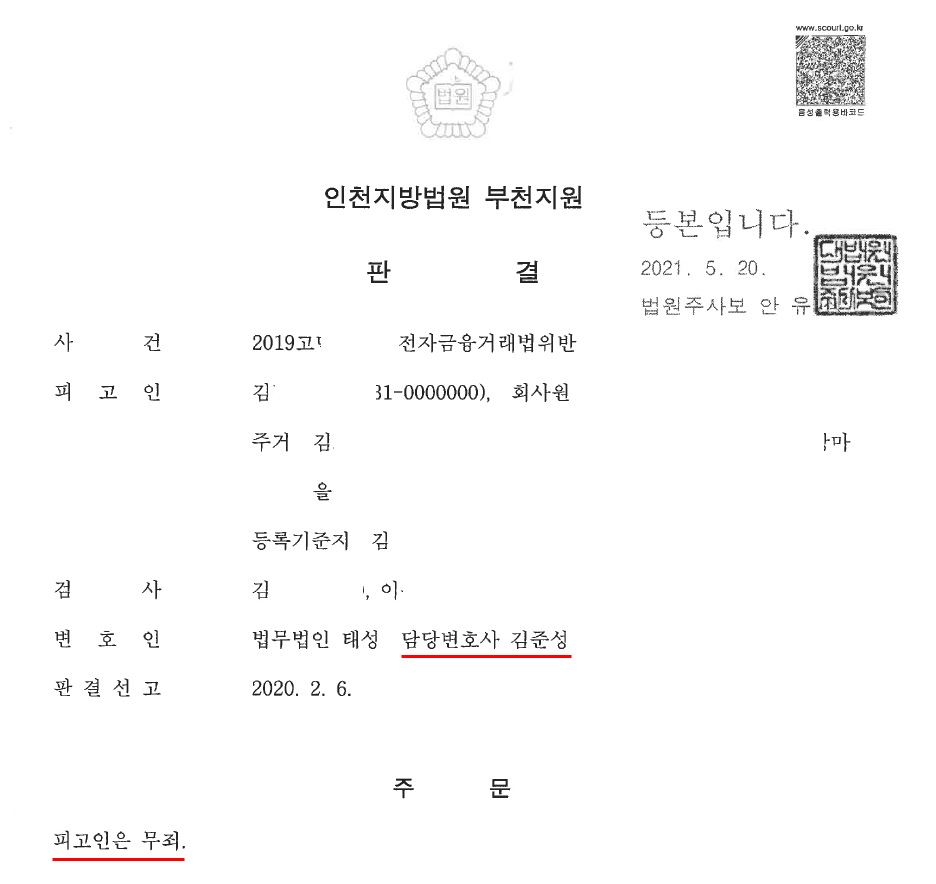 [전자금융거래법위반 혐의] : 김준성 변호사의 도움으로 무죄판결
