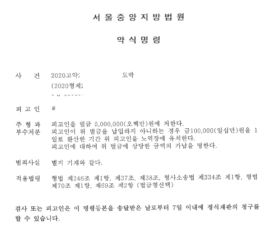 서울중앙지방법원은 피고인에게 도박 혐의만을 적용하여 구약식 처분을 내렸습니다.