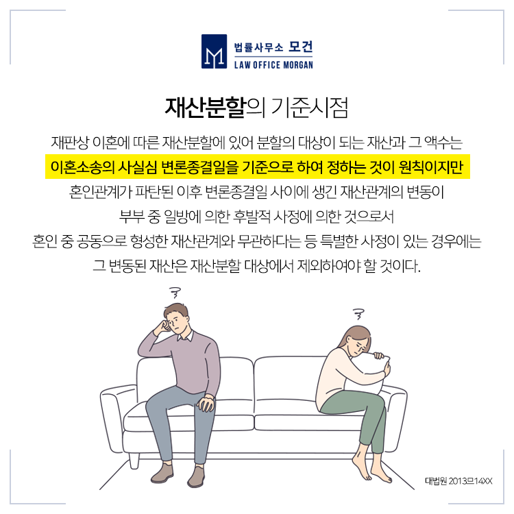 부부가 이혼하면 그간 쌍방의 협력으로 이룩해온 공동재산을 형평에 맞게 분배하는 것을 '재산분할'이라 합니다. 협의이혼 시에는 당사자 간 협의에 따라 재산을 분배하지만 협의가 불가한 사항에서는 이혼소송으로 진행되어 법원의 판단 하에 재산을 분배하게 됩니다.