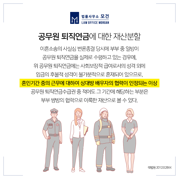 A씨는 매월 216만원을 퇴직연금으로 수령하였는데, A씨가 퇴직연금을 스스로 관리한 기간인 2015년 9월부터 이혼소송 변론종결일 무렵인 2017년 2월까지 총 18개월 치의 퇴직연금 합계액은 3,900만원이었습니다. 다만, A씨의 공무원 재직기간은 28년이고, 그 중 B씨와의 혼인기간은 10년인 점을 감안하면, 혼인기간이 전체 재직기간이 35% 정도에 그치는 사정을 재산분할 시 참작해야 한다고 보았습니다(대구가정법원 2015드단107XXX).