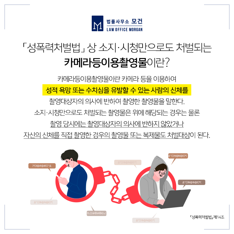 「성폭력처벌법」 제14조에 해당되는 '카메라등이용촬영죄'는 카메라나 그 밖에 이와 유사한 기능을 갖춘 기계장치를 이용하여 성적 욕망 또는 수치심을 유발할 수 있는 사람의 신체를 촬영대상자의 의사에 반하여 촬영한 자와 이를 배포, 판포, 소지, 시청 등을 한 자를 처벌하는 규정을 두고 있습니다.