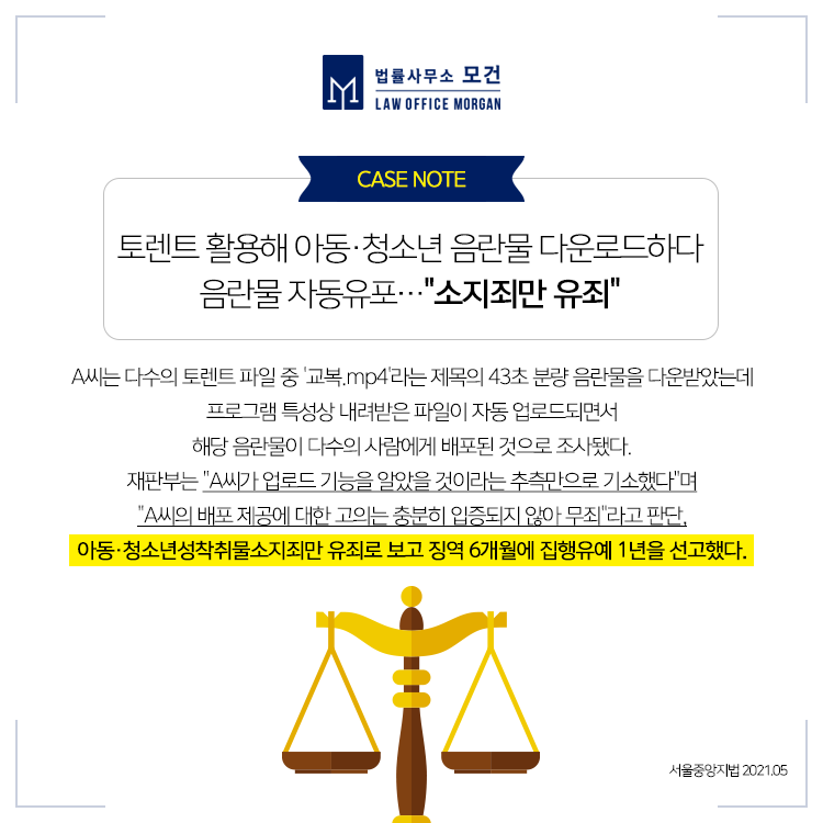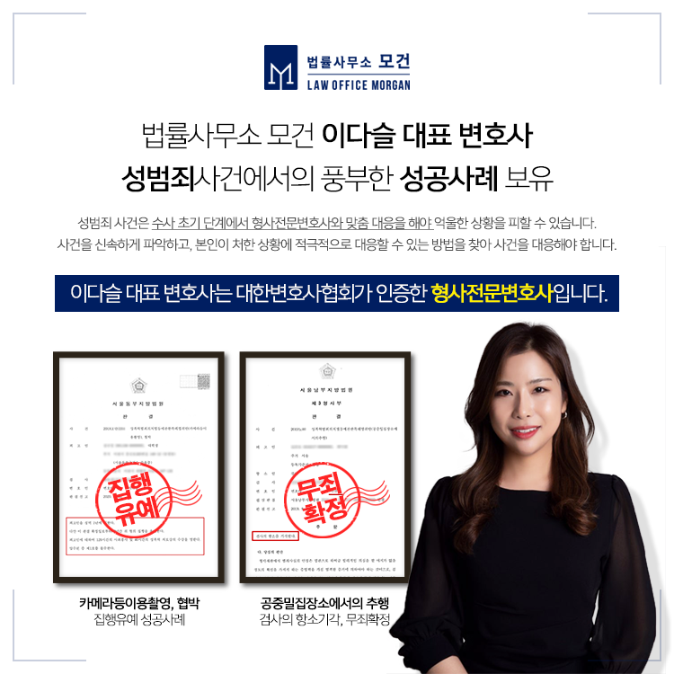 법률사무소 모건의 이다슬 대표 변호사는 다수의 성범죄 사건을 해결해 온 형사전문변호사로서, 사건 초기단계에서부터 재판에 이르기까지 적극적인 법률조력을 제공하고 있습니다. 상담예약 시 대표 변호사가 직접 상담하며, 서울, 경기, 인천, 수원 등 지역상관없는 비대면 상담 역시 가능하니 음란물, 성착취물과 관련한 혐의를 받고 계시다면 형사전문변호사의 상담을 통해 사건을 정확히 분석하고 이에 맞은 해결책을 강구하시기 바랍니다.