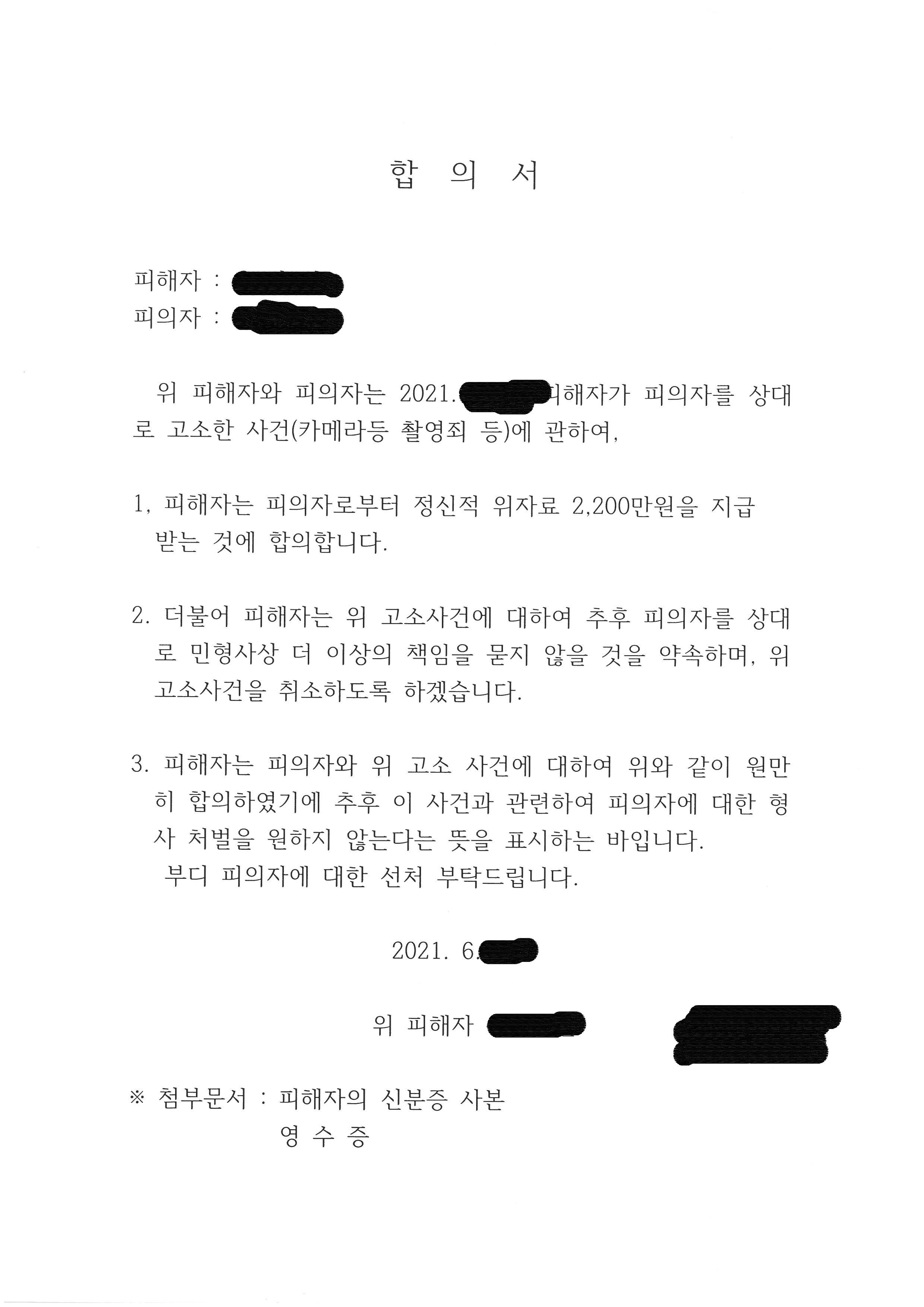 5. 피해 여성의 뜻에 반하는 합의는 절대 진행하지 않습니다. 합의가 되지 않을 경우 민사소송도 가능하므로 절대 불리한 조건의 합의에는 응하지 않는다는 원칙을 고수하였습니다.