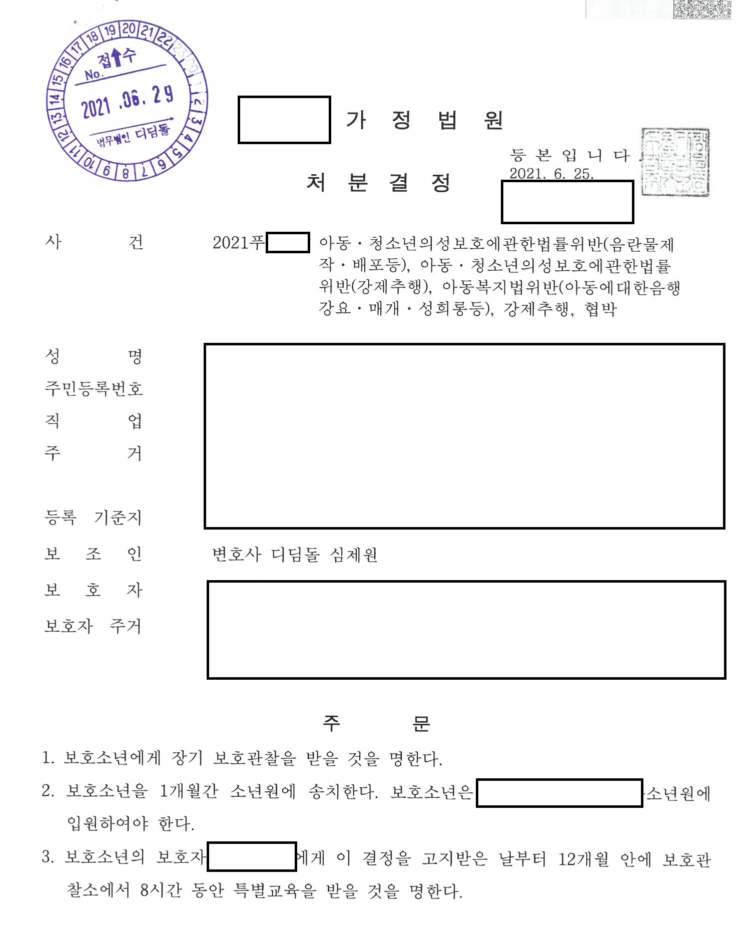 제가 수행하던 소년보호사건 결정이 나와서 포스팅을 합니다. 형사사건부터 수행을 했고, 구속영장까지 청구되었던 사건입니다. 다행히 형사법원에서 소년부 송치 결정이 나왔고, 가정법원에서 처분결정이 나오게 되었습니다.