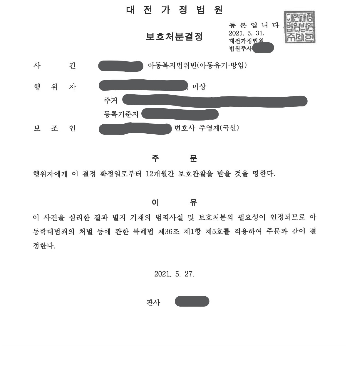 법원은 위와 같은 주영재 변호사의 주장을 받아들여 행위자에게 1년간 보호관찰을 받으라는 보호처분만 내렸고, 이로 인해 행위자는 다시 피해아동들과 같이 살 수 있게 되었습니다.