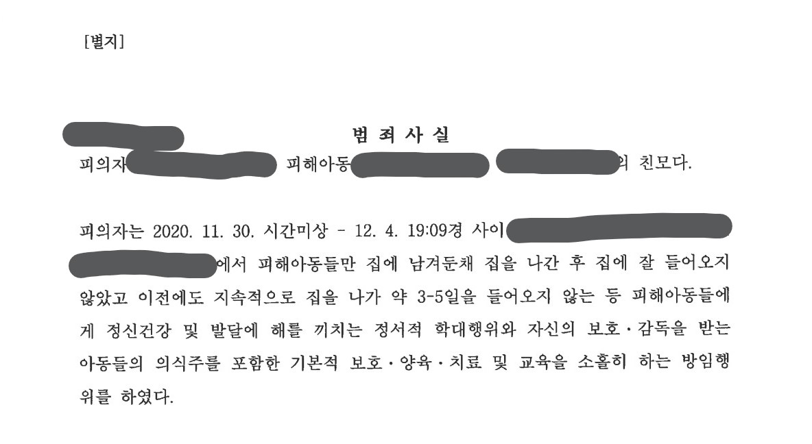 행위자는 2020. 11월경부터 타 지역에 사는 남자친구를 만나기 위해 피해아동들만 집에 남겨두고 외박하는 경우가 많아졌고, 그럴 때마다 피해아동들은 냉장고에 남겨진 음식을 스스로 챙겨먹거나 행위자에게 전화해 음식을 배달시켜 배를 채웠습니다.