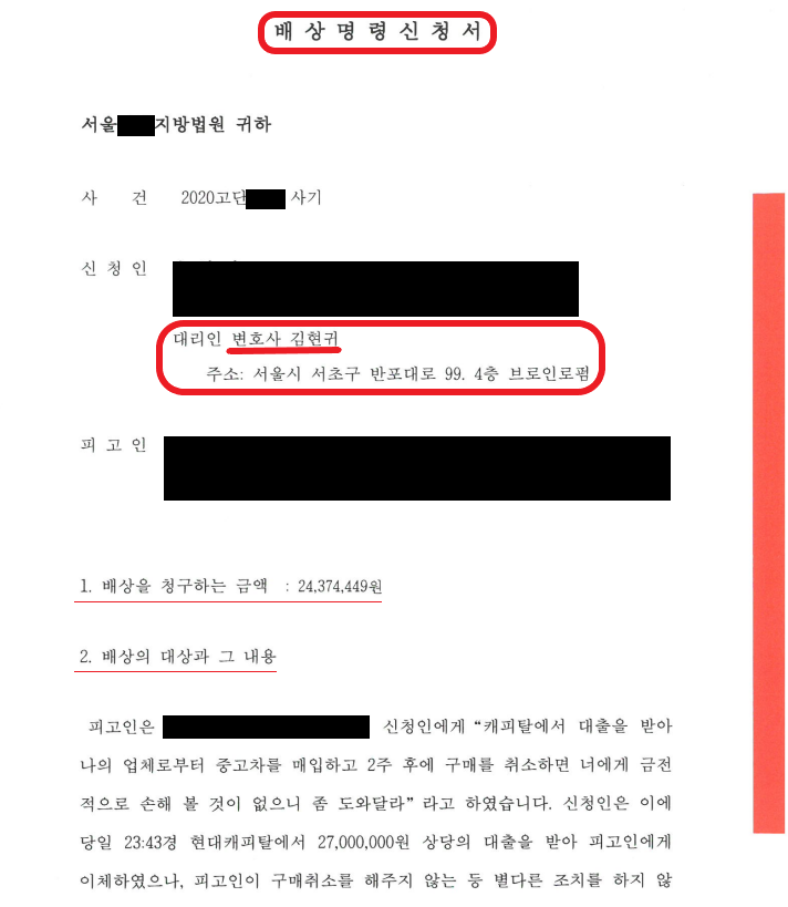 B씨가 유죄로 확정된 후에도 배째라고 할 수있겠죠? 그러면 A는 다시 민사소송 절차를 거쳐야 하는 번거로움이 있습니다. 이런 경우를 대비하여 사기죄의 피해자는 피고인의 형사 재판부에 배상명령신청을 할 수있습니다. 인정될 시 피고인에게 유죄가 선고되면, 마치 민사로도 승소한 것과 같은 효력을 줍니다. 의뢰인을 위하여 형사 공판 기일날 참석하여 배상명령신청서도 제출한 상태입니다.