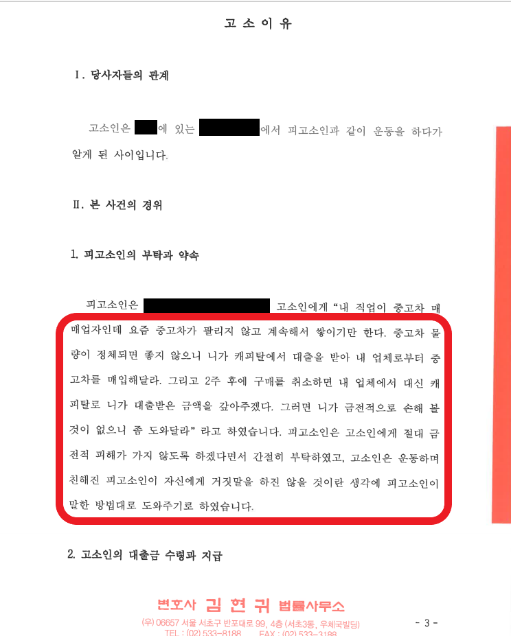 어느 날 B씨가 힘든 얼굴로 A에게 부탁을 합니다. 그 내용은 "코로나 때문에 중고차 시장이 힘들다. 중고차 물량이 쌓이면 업체가 힘들어지니 니가 나로부터 중고차 한대를 구매해줘라. 그렇게 해서 내 실적을 올려주면 일주일 내로 차량 구매를 취소해줘서 금전적 피해가 없도록 하겠다'는 것이었습니다. A는 많은 고민을 한 끝에 '설마 이 형이 나에게 사기를 치겠어?"라는 마음으로 도와주기로 하였습니다. 그래서 카드사 대출을 2500만원 받아 차량 구매를 하게 됩니다. (물론 A씨는 자신이 구매한 '척'한 차량을 전혀 본 적도 타본 적도 없습니다.)