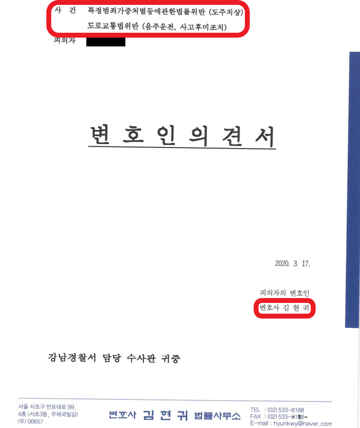 문제는 음주운전 혐의입니다. 의뢰인은 자신이 차량 안에만 있었고 다음 날 술에 깬 이후에 경찰의 연락을 받았다고 하면서 음주운전 혐의를 부인하기를 원하셨습니다. 하지만 의뢰인에게 "경찰이 동선 조사를 통하여 충돌 전 방문한 술집의 CCTV와 영수증을 조사할 것이며, 충돌 전 도로 위 CCTV만 보아도 차량이 흔들리는 것을 통하여 음주사실을 증명해낼 것이다. 그러니 혐의를 인정하는 것이 좋아보이며 부인할 시 판사가 양형시에 매우 좋지 않은 영향을 줄 것이다"라고 설명드렸습니다. 조언을 받아들인 A는 음주혐의도 자진하여 인정하기로 하였습니다.