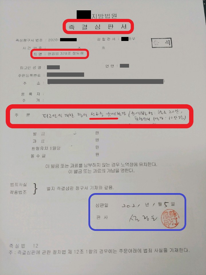 애초에 검찰로 송치되어 기소유예만 받아도 너무 좋을 것 같았는데, 즉결 심판으로 회부되게 되어 최고의 결과가 나온 것이었죠.