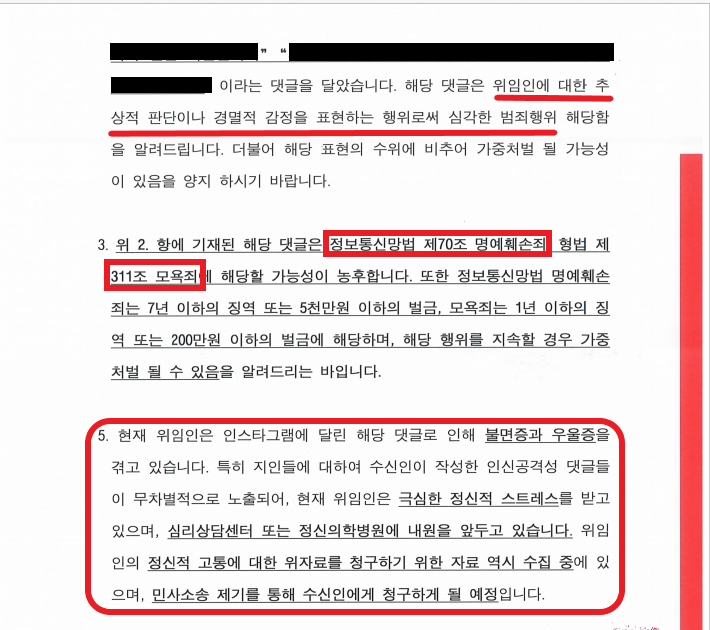 A의 SNS에 방문한 불특정 다수의 사람들이 위 글을 보게 되었습니다. 이로 인하여 A는 극심한 정신적 고통을 겪고 있었는데요. A의 상간행위와 별개로, B의 딸이 위 글을 게시한 것은 명백한 형사상 범죄입니다. 저는 의뢰인을 대리하여 B의 딸을 상대로 글을 내려달라는 취지의 내용증명을 보내었습니다.