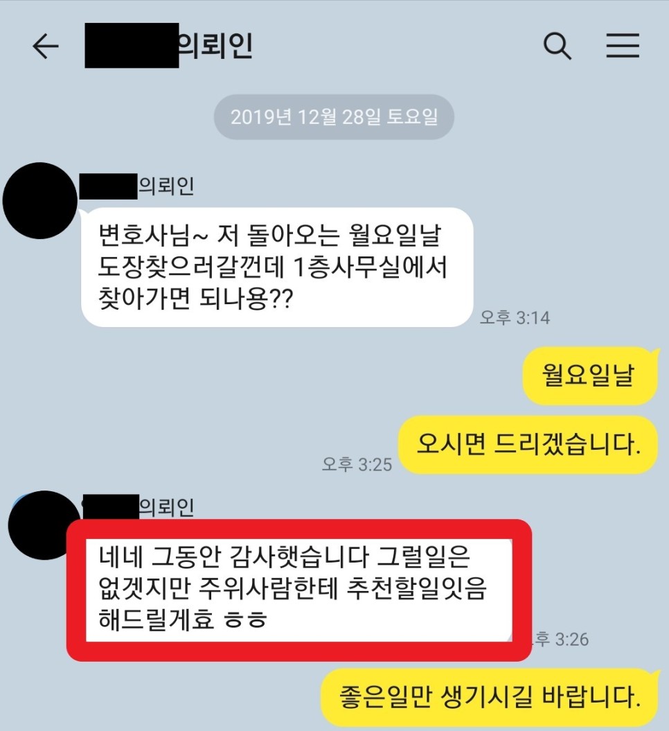 결국 B의 아내와 딸은 변호사를 통하여 합의조건을 제시해왔습니다. 자신들이 A에게 제기한 6천만원 소송을 취하할테니, B의 딸에 대한 고소를 취하해 달라는 것이었습니다. A역시 합의조건에 동의하여 합의서가 작성되었습니다. 그 결과 의뢰인에 대한 소송은 전부 취하되었고 의뢰인은 다시 일상으로 돌아갈 수 있었습니다.