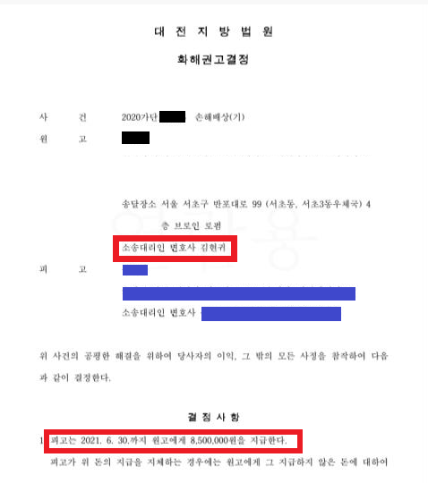 의뢰인A 에게 전화하여 가장 원하는 사항 두 가지를 여쭤본 결과 ① 긴 소송에 지쳐서 하루 빨리 적정한 배상을 받고 소송에서 해방되고 싶다는 것 ② 향후 B가 남편에게 구상권 청구를 하지 않게 만드는 것이었습니다. B측에게 소송 끝까지 가면 1500정도로 큰 금액이 인정될 것이라는 점을 말하고, 향후 남편에게 구상권 청구를 하지 않는다는 조건으로 850만원을 지급할 것을 요구하였습니다. B 측 역시 고민끝에 남편에 대한 구상권 청구 및 모든 권리를 포기한다는 조건으로 응하였습니다.