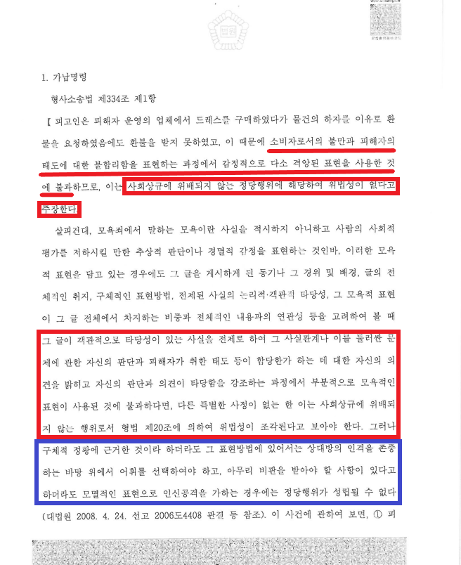 [공판의견서에 기재한 의견들 - 저급한 표현 / 실명 적시 / 정당행위에 해당하지 않는 이유 등이 모두 그대로 인정되었다]
