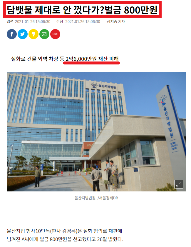 오늘 울산지방법원 형사10단독 (김경록 판사)은 담뱃불을 제대로 끄지 않고 분리수거장에 버려 화재를 낸 A에게 벌금 800만원을 선고하였습니다. A는 지난 해 5월 식당 건물 옆에서 담배를 피운 뒤 스티로폼과 종이박스 등이 쌓여 있던 쓰레기 분리수거장에 불씨를 털어버렸고 이로 인하여 2억 6천만원의 손해를 발생시켰습니다.