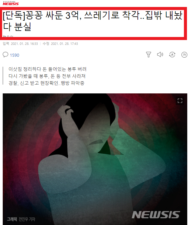 며칠 뒤 이 사실을 알게 된 수진씨는 황급히 쓰레기장으로 달려갔습니다. 비닐 봉지를 찾긴 하였으나 안에 담요만 있었을뿐... 3억원은 연기처럼 사라져버렸죠. 종암경찰서에 이 사실을 알렸고 수사가 시작되었습니다. (기사에서 "돈의 행방을 파악하는데 어려움을 겪고 있다"라고 기재된 것을 보면, 근처에 CCTV가 없는 것이 아닌가 추정됩니다)