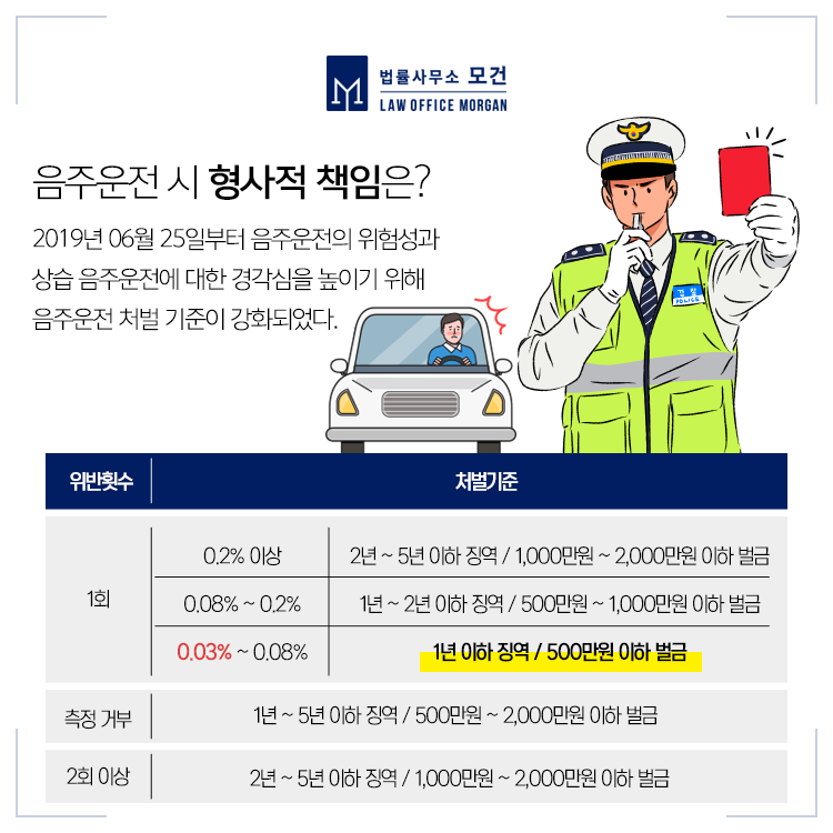 2019년 6월 「도로교통법」 개정안 시행에 따라 음주운전 단속 기준이 강화되었습니다. 이전까지는 혈중알코올농도 0.05% 이상이면 면허정지, 0.1% 이상이면 취소처분이 내려졌는데요. 현재는 혈중알코올농도가 0.03% 이상이면 처벌대상이 되고, 0.08% 이상이면 면허취소 처분이 내려집니다. 기준 강화에 따라 이른바 숙취운전으로도 음주단속에 적발될 가능성도 한층 높아진 것입니다.