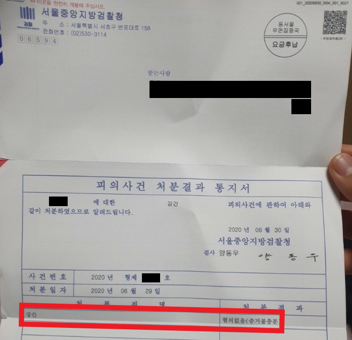 다행히 수사기관은 B의 고소 사실을 배척하고 저희 측 주장을 모두 인용하여 강간 혐의에 대하여 무혐의 불기소 처분하였습니다.