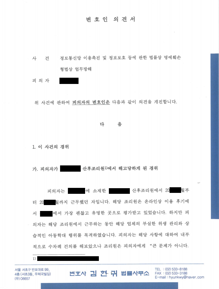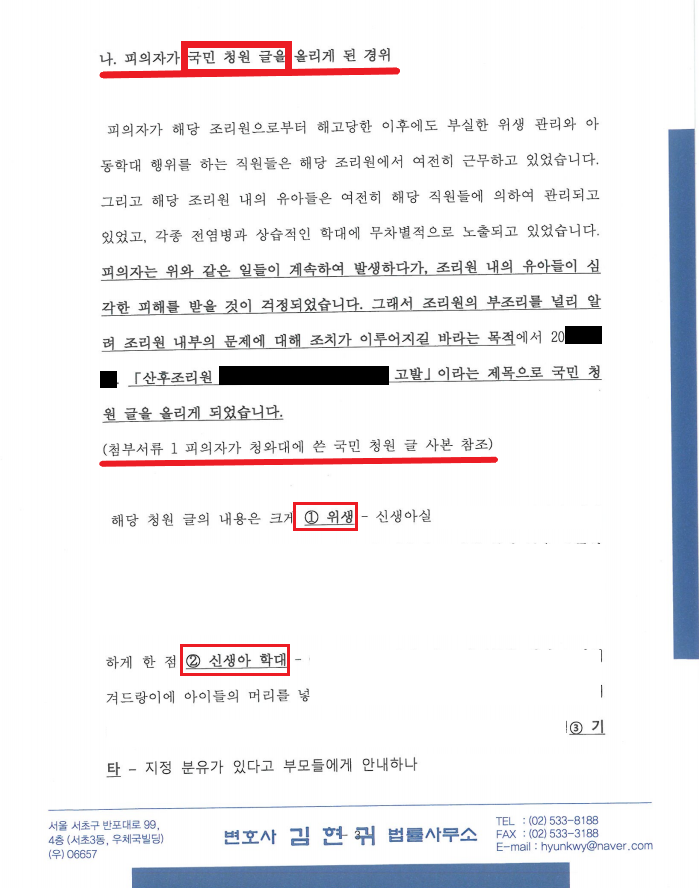 그러자 산후조리원 측은 국민청원에 반박글을 올리게 됩니다. 그 내용은 의뢰인이 평소 업무 능력이 좋지 않았고 동료들과 불화를 일으킨 자이며, 국민청원글은 금전을 요구하면서 악의적인 목적으로 올린 허위 사실이라는 것이었죠. 그리고 의뢰인을 명예훼손 및 업무방해 혐의로 고소하였습니다. 이에 대응하고자 저를 찾아오게 되었습니다.