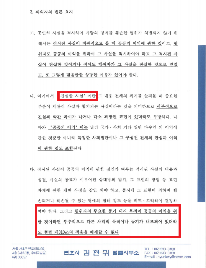 2차례에 걸친 변호인 의견서를 통하여 ① 국민청원글 내용이 전체적으로 진실한 사실인 점 ② 설령 사실과 다른 부분이 있더라도 의뢰인이 자신이 목격한 것으로서 진실이라고 굳게 믿었기에 형법 제15조 1항에 의하여 진실한 사실로 취급되어야 하는 점 ③ 의뢰인이 국민청원글을 게시한 목적이 공익적 목적인 점 ④ 그러므로 형법 제310조에 의하여 위법성이 조각되어야 한다는 점 ⑤ 업무방해는 허위사실을 유포하거나 위계 내지 위력을 행사함이 행위 태양인 바, 의뢰인이 올린 글은 진실한 사실로 취급되어야 함으로서 구성요건 해당성 자체가 부정된다는 점 들을 적극 주장하였습니다.