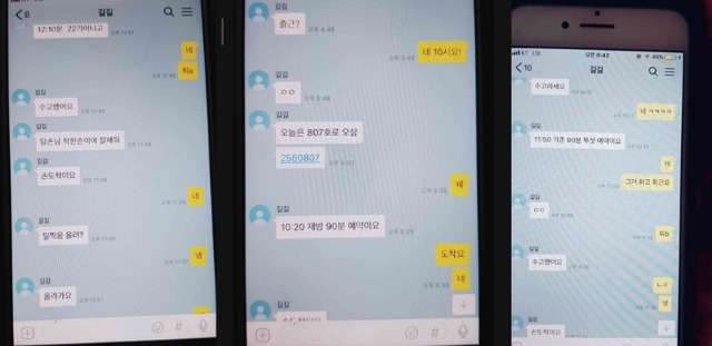 "출근?" "오늘은 807호로 오삼" "(비밀번호를 찍어줌)" "10:20 재방 90분 예약이요" "11:50 기존 90분 투샷 예약이요"