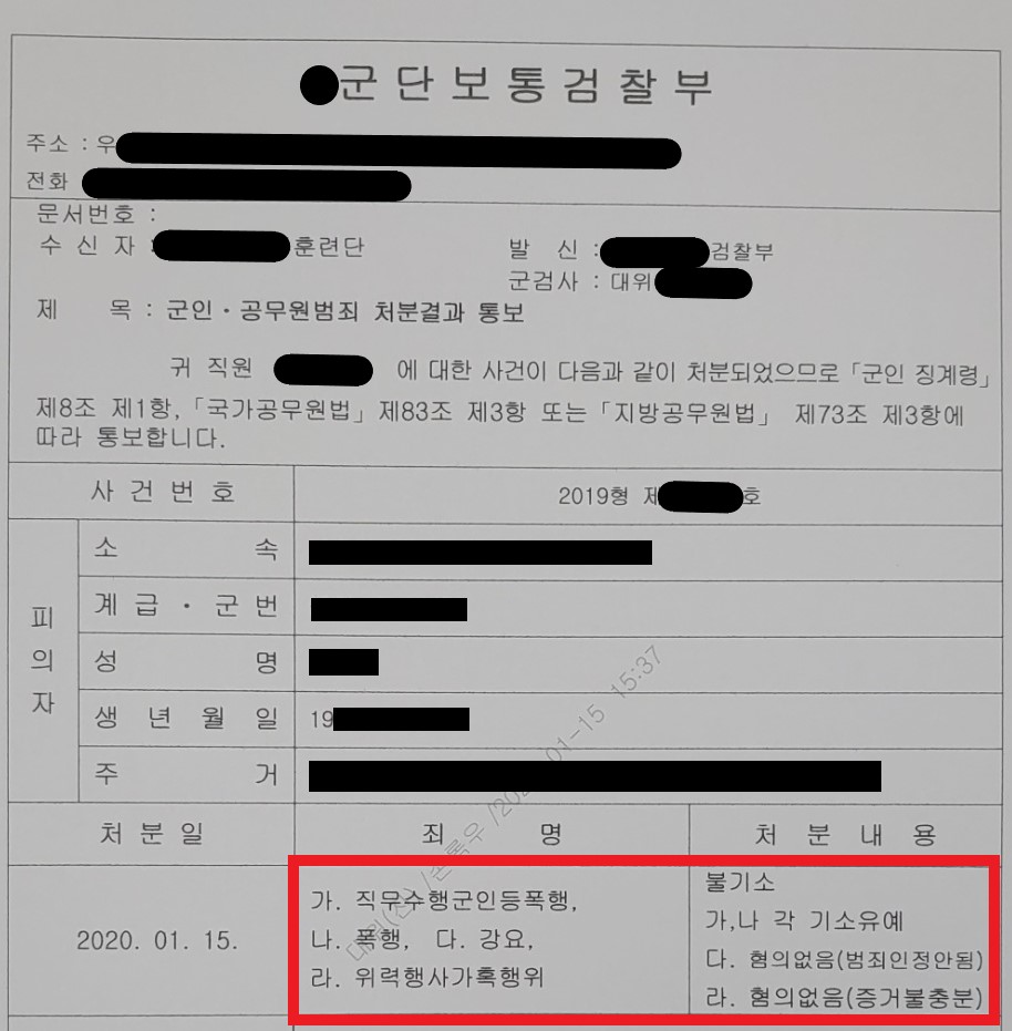 위에서 언급한 사항들을 상세히 설명하는 의견서, 후임 두명과의 합의서를 제출하고 지방에서 있었던 헌병대 조사에 직접 동석하여 진술 시 조력을 하였습니다. 그 결과 군 검찰은 군인 폭행 혐의에 대해서는 의뢰인이 범행에 이르게 된 사정에 대한 변호인의 의견을 받아들여 기소유예의 선처를 내렸고, 강요와 가혹 행위 혐의에 대한 변호인의 의견을 모두 받아 들여 무혐의 불기소 처분을 하게 되었습니다.