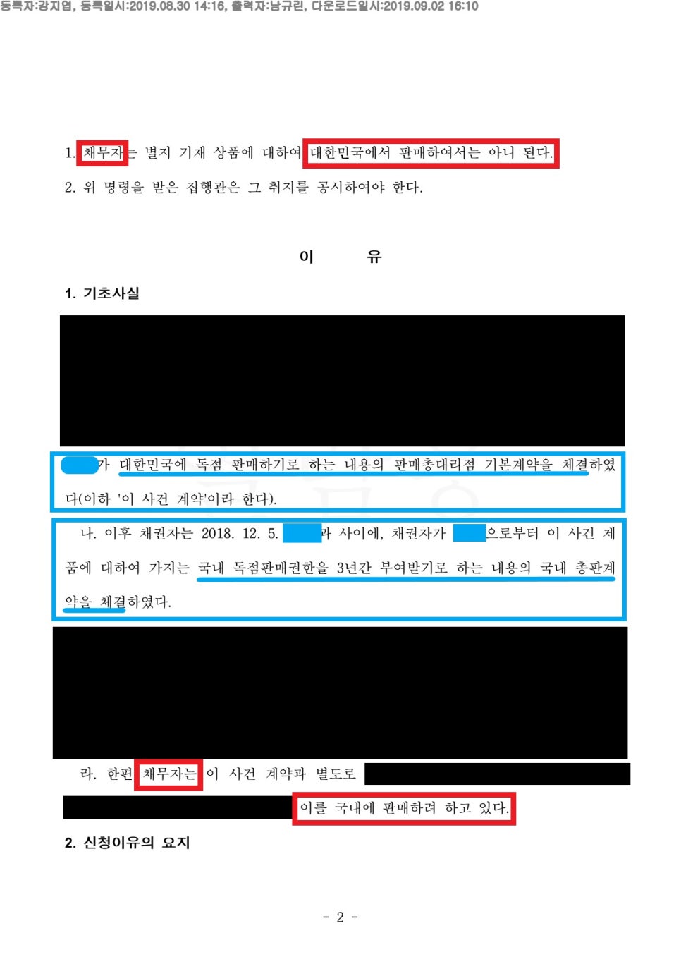 (아래 판결문에서 청구취지1을 볼 시, 의뢰인 회사의 자회사 (채무자)가 대한민국에서 신제품을 아예 판매할지 말것을 청구하고 있다)