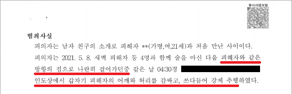한참의 시간이 흐른 뒤, 동네 친구들은 술에 만취하여 집으로 돌아갔습니다. B씨 역시 집으로 돌아가려고 하자, A씨는 B씨에게 "택시 타는 곳까지 바래다주겠다"라고 하며 B씨와 나란히 걷기 시작하였습니다.