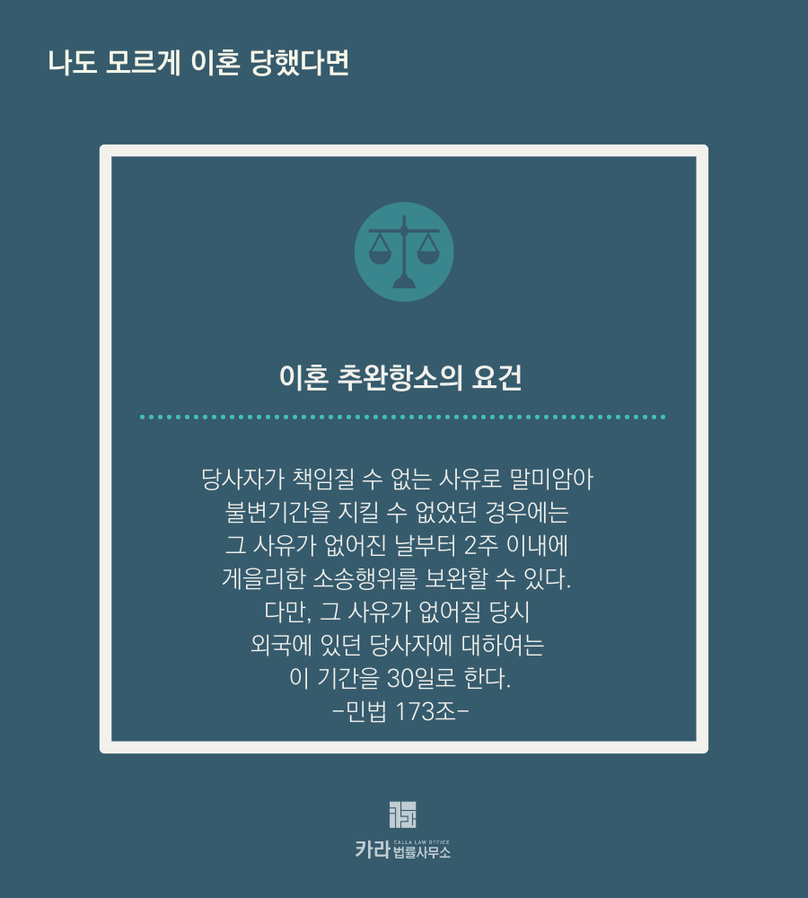 본인의 과실없이 공시송달 이혼되었다면 추완항소를 통해 소송을 진행할 수 있습니다.