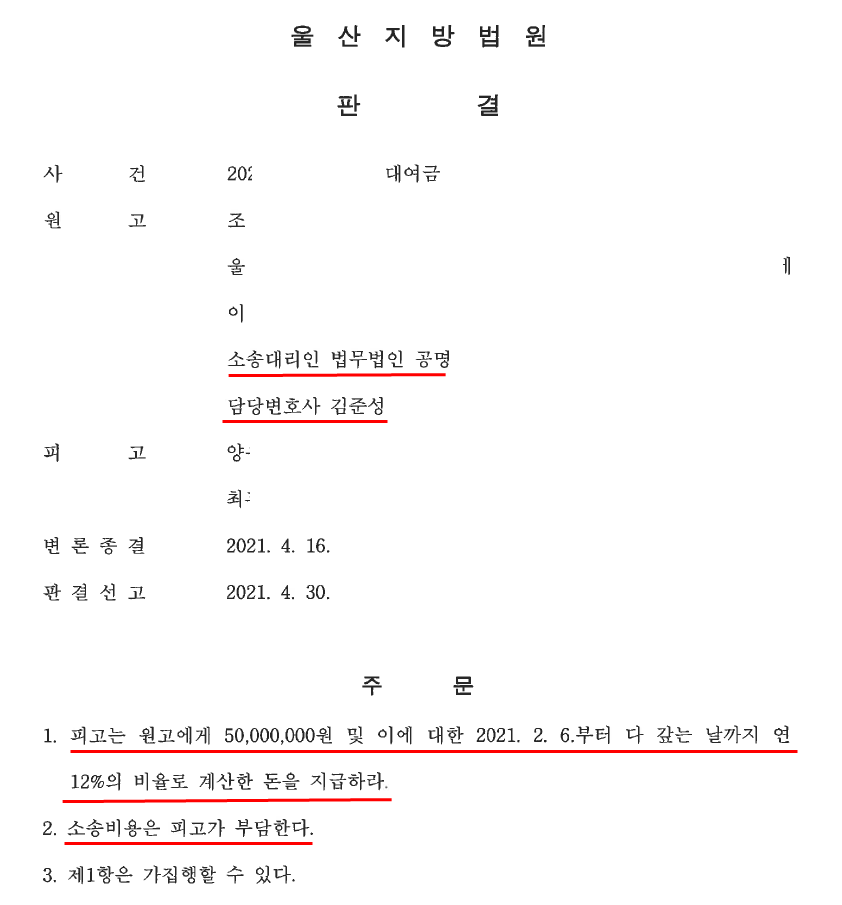 [대여금 청구 소송] : 김준성 변호사의 도움으로 전부승소