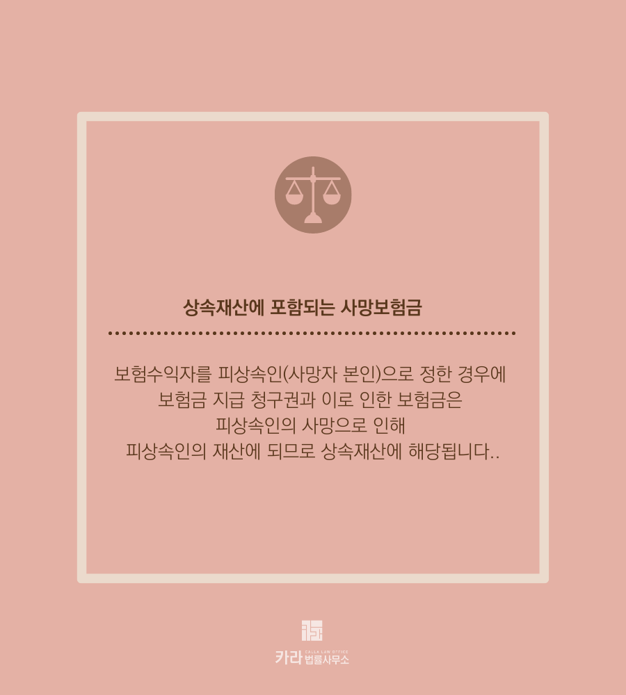 반면, 보험수익자를 피상속인(사망자 본인)으로 정한 경우에 보험금 지급 청구권과 이로 인한 보험금은 피상속인의 사망으로 인해 피상속인의 재산에 되므로 상속재산에 해당됩니다.