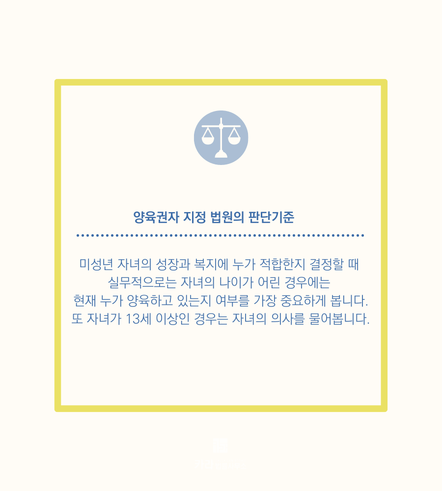 법원은 객관적으로 자녀의 성장과 복지에 있어 어느 부모에게 양육권을 주는 것이 바람직한 것인지 심사숙고하여 결정을 내립니다.