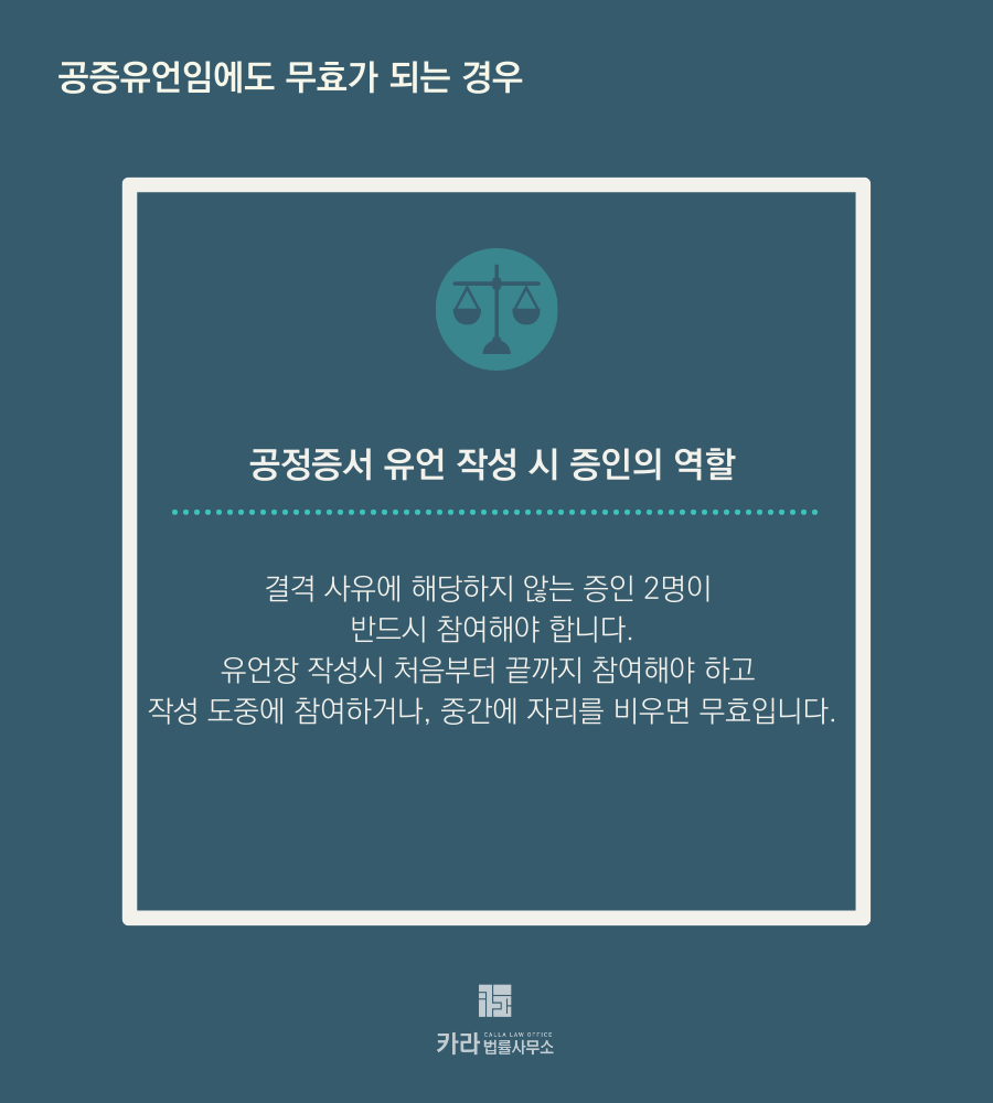 간혹 유언 공증을 하기 위해 공증인 사무소를 찾았다가 증인 2명을 구하기 어려워 공증사무소 직원이 증인을 대신 서는 경우도 있는데, 이렇게 되면 증인결격자가 공증 유언에 참여한 것이 되어 전체가 무효가 될 수 있습니다.