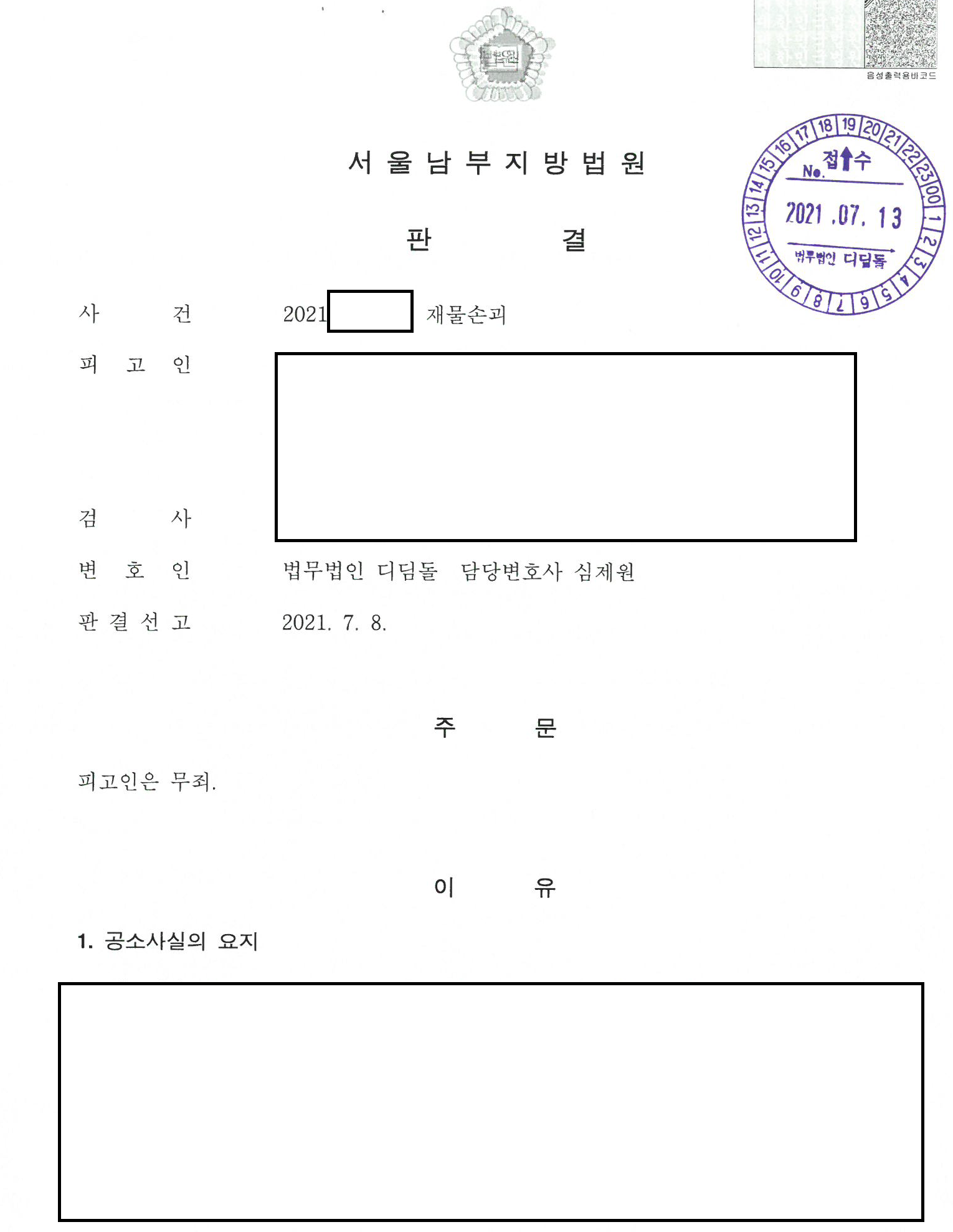 오늘은 재물손괴에 대해 무죄판결을 받은 사건을 포스팅합니다. 서울남부지방법원입니다.