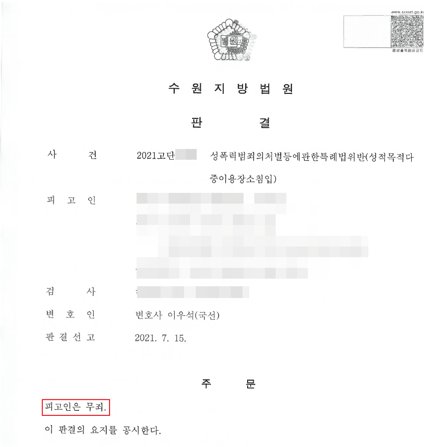 국선변호인으로 선정되어 맡은 사건입니다. 피고인은 친구와 함께 처음 피씨방에 갔다가 남녀화장실을 착각하여 여자화장실에 들어가서 수사를 받게되고 결국 성폭력범죄의처벌등에관한특례법위반으로 기소되었습니다.