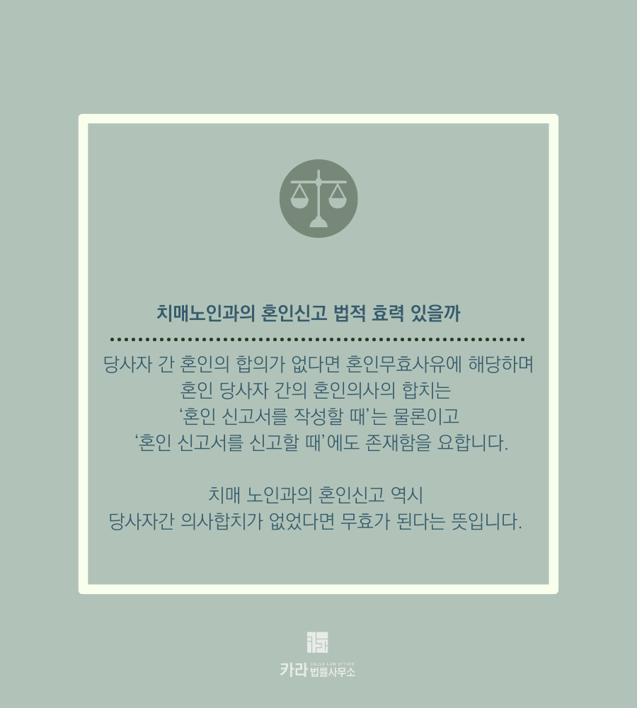 치매 노인과의 혼인신고 역시 당사자간 의사합치가 없었다면 무효가 된다는 뜻입니다.