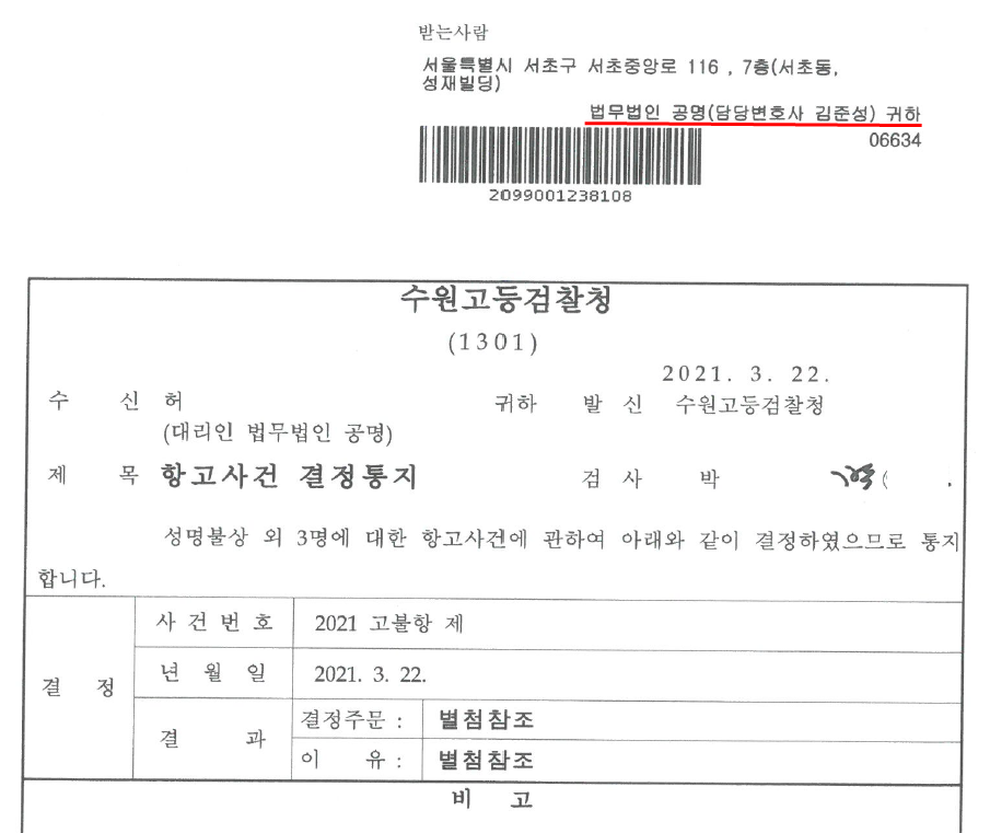 수원고등검찰청은 김준성 변호사의 위 주장을 받아들여 재기수사명령 결정을 하였습니다.