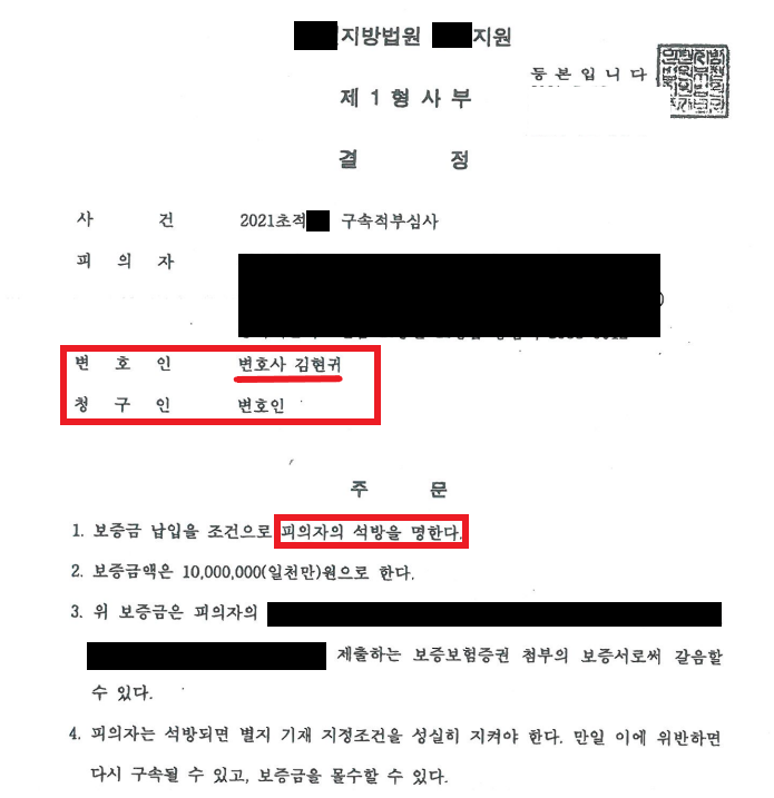 정말 다행히도, 법원은 검사의 판단을 배척하고, 변호인의 의견을 받아들여 피의자에 대한 석방을 명하였습니다. 구속할 필요가 있다는 검사의 주장을 완전히 배척한 것입니다. 피의자는 다행히도 앞으로의 수사와 재판과정을 가족의 품에서 받을 수 있게 되었습니다. 가능성은 5%미만으로 보고 마음을 졸이던 피의자의 가족, 남자친구에게는 천만다행인 소식이었습니다.