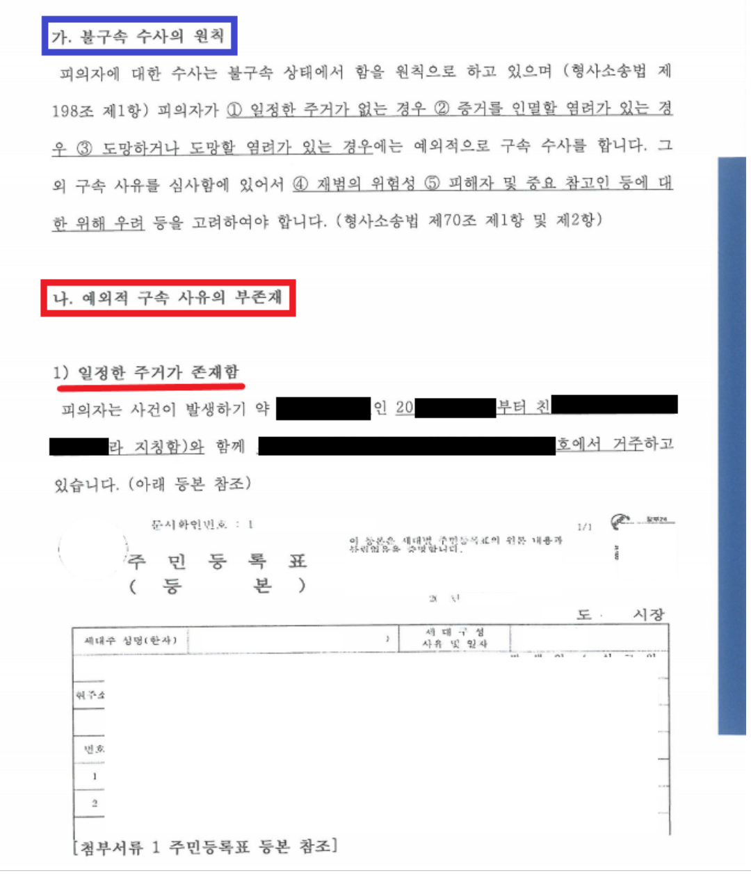 그리고 피의자의 경우 친오빠와 지내는 일정한 주거가 있으며, 왜 도망가거나 증거를 인멸할 염려가 없는지를 각증 근거와 함께 상세히 설명하였습니다.