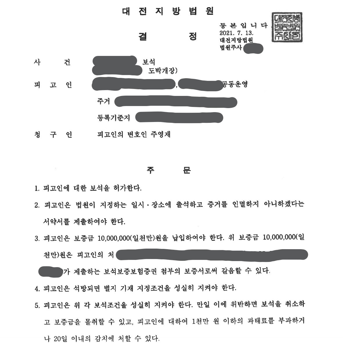 법원은 위와 같은 주영재 변호사의 주장을 받아들여 보증금 1,000만 원을 납입하는 조건으로 보석을 허가하였고, 피고인은 결정 당일 보증금을 납입하고 석방됐습니다.