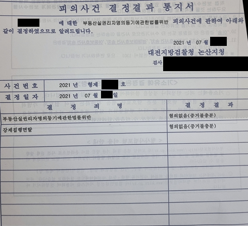 검찰은 증거불충분으로 강제집행면탈과 부동산실명법위반 혐의 모두에 혐의없음(증거불충분)처분을 하였습니다.