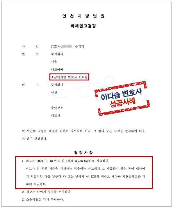 이다슬 대표 변호사는 용역비를 지급받지 못한 의뢰인을 대리하여 용역비청구소송을 진행하였습니다. 미지급된 용역비는 8,788,450원으로 소액사건재판으로 진행되었는데요. 의뢰인이 청구한 8,788,450원의 금액이 모두 받아들여지면서 법원의 '화해권고결정'이 내려졌고 확정된 사건입니다. 또한 정해진 지급기일까지 피고측이 지급을 지체하는 경우 연 12%의 지연손해금까지 받을 수 있게 되었습니다.
