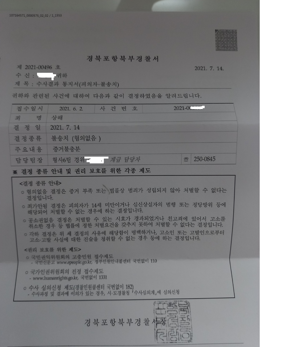 이러한 결과로 저희 의뢰인은 상대방의 상해고소에서 경찰단계에서 무혐의라는 좋은 결과를 받을 수 있었습니다. 반면에 상대방은 특수협박과 폭행 혐의가 기소되어 실형을 살아야 할 위기입니다.