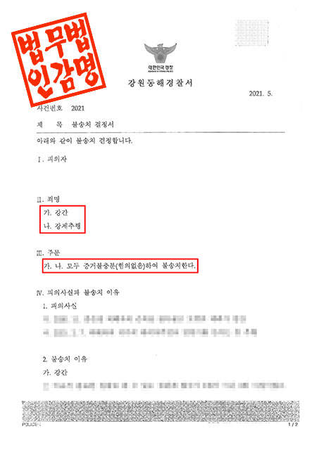 강원동해경찰서는 이 사건에 대해 다음과 같은 사유로 불송치 결정 처분을 하였습니다.