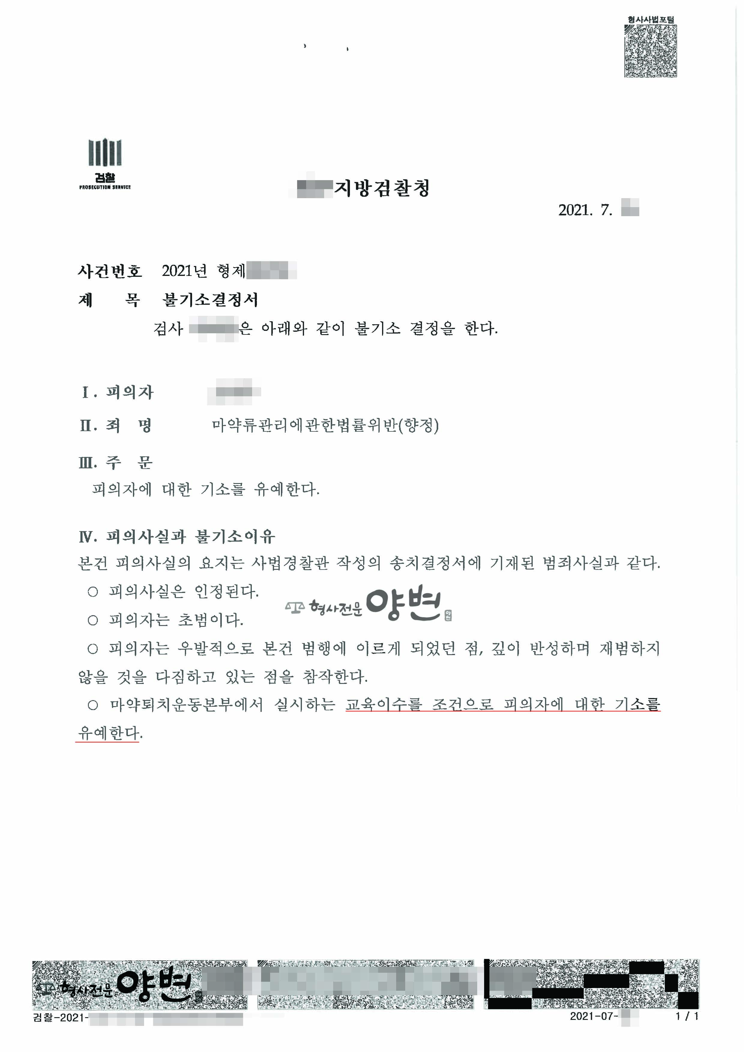 그리고 검찰단계에서는 ‘허브’에 대한 접근성 및 특징을 고려한 정상참작사유를 주장하는 한편, 향정신성의약품에 대한 단약의 의지를 보여줄 수 있는 양형자료를 준비·제출함으로써, 최대한의 선처를 구하였습니다.