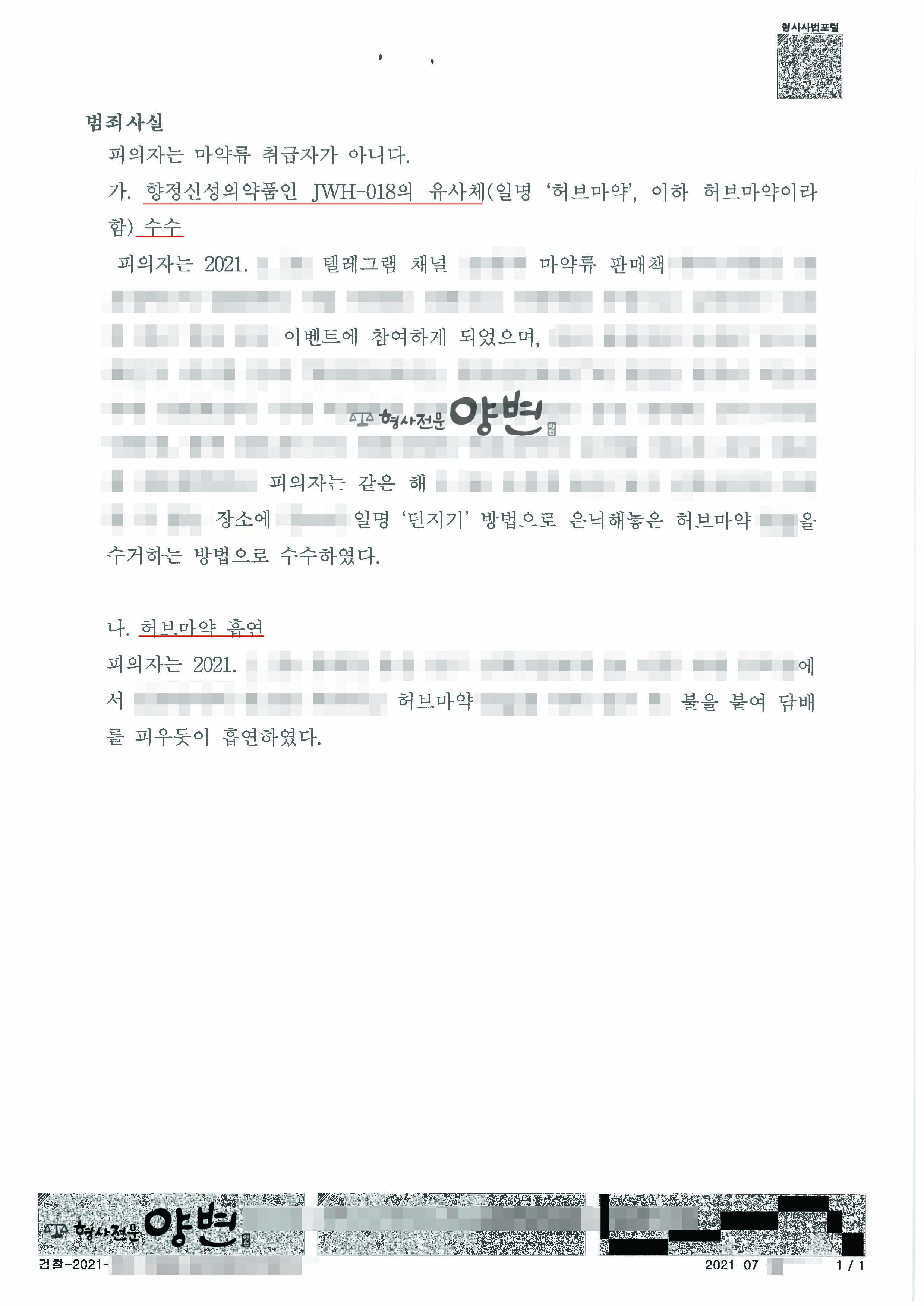 의뢰인은 마약류 판매책이 개설한 텔레그램 채널에서 이벤트에 당첨되어 허브(=합성대마, JWH-018)를 수수하고 흡연하였다는 혐의로 입건되어 본 변호인을 찾아왔습니다.