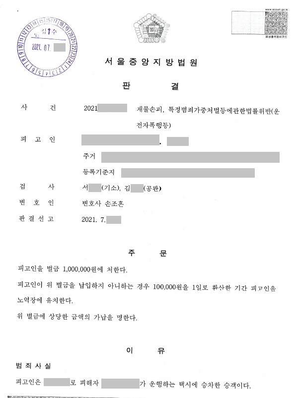의뢰인은 평범한 회사원으로 지인들과 회식을 마치고 택시를 타고 귀가하던 중 만취상태에서 택시기사를 폭행하고, 택시를 손괴한 사실로 입건되어 손조흔 변호사사무실을 내방하였습니다.