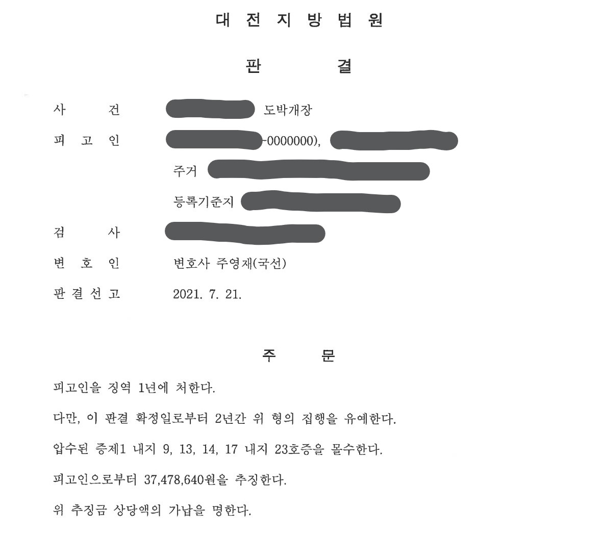 한편, 영리의 목적으로 도박을 하는 장소나 공간을 개설한 사람은 도박개장죄가 성립하며, 도박을 한 사람보다 중한 처벌을 받습니다.