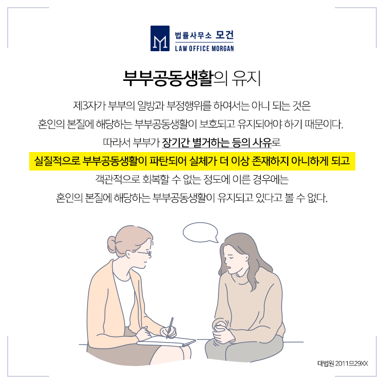 배우자의 외도는 이혼소송의 사유가 되고, 이로 인해 혼인이 파탄되거나 부부 일방에게 참을 수 없는 정신적 고통을 준 상간녀·상간남에게는 위자료청구소송이 가능합니다. 그런데 부부가 이미 별거 중에 있었던 경우라면 이혼소송이나 상간녀소송의 쟁점이 달라질 수 있음을 유의하셔야 합니다.